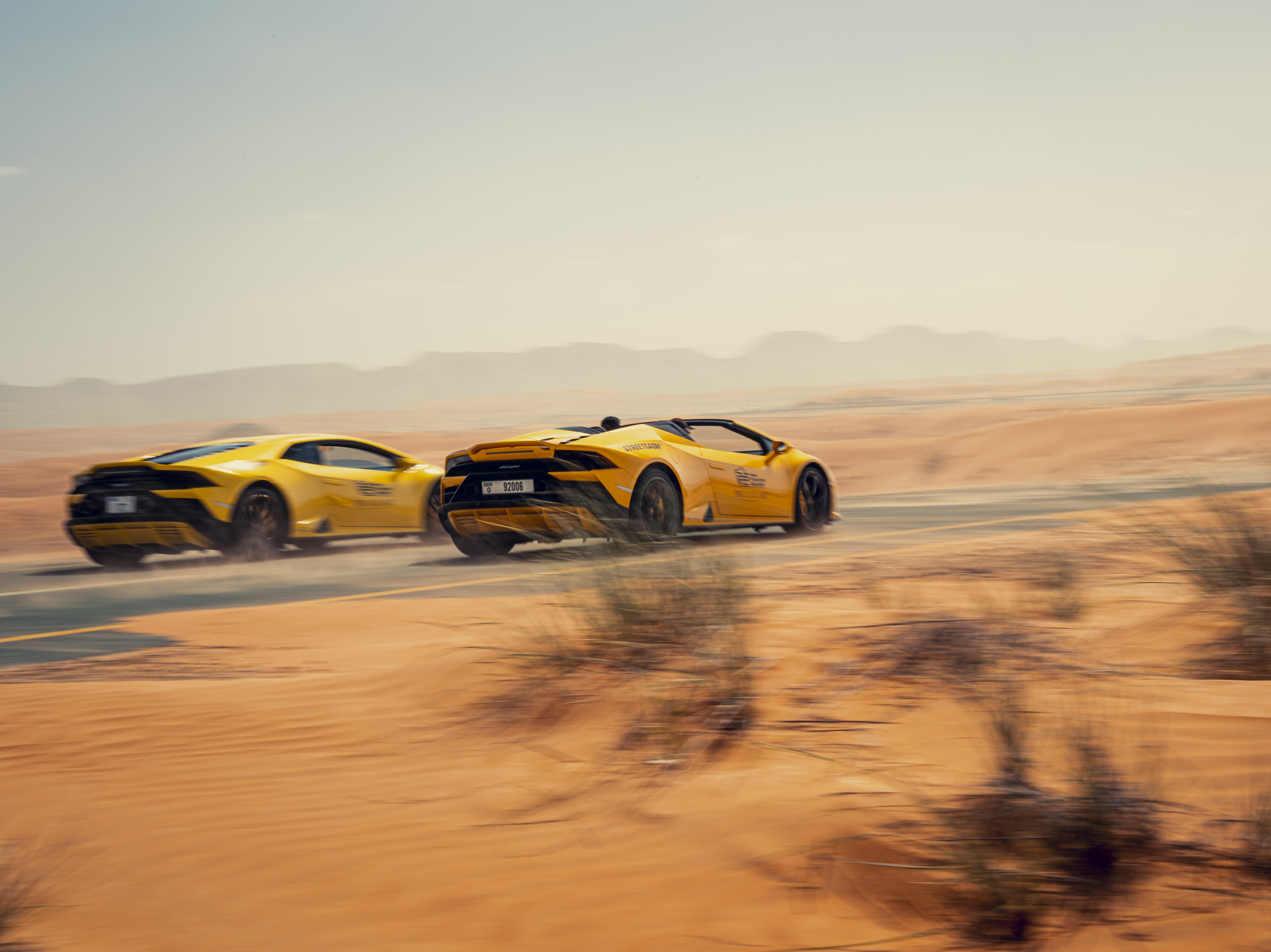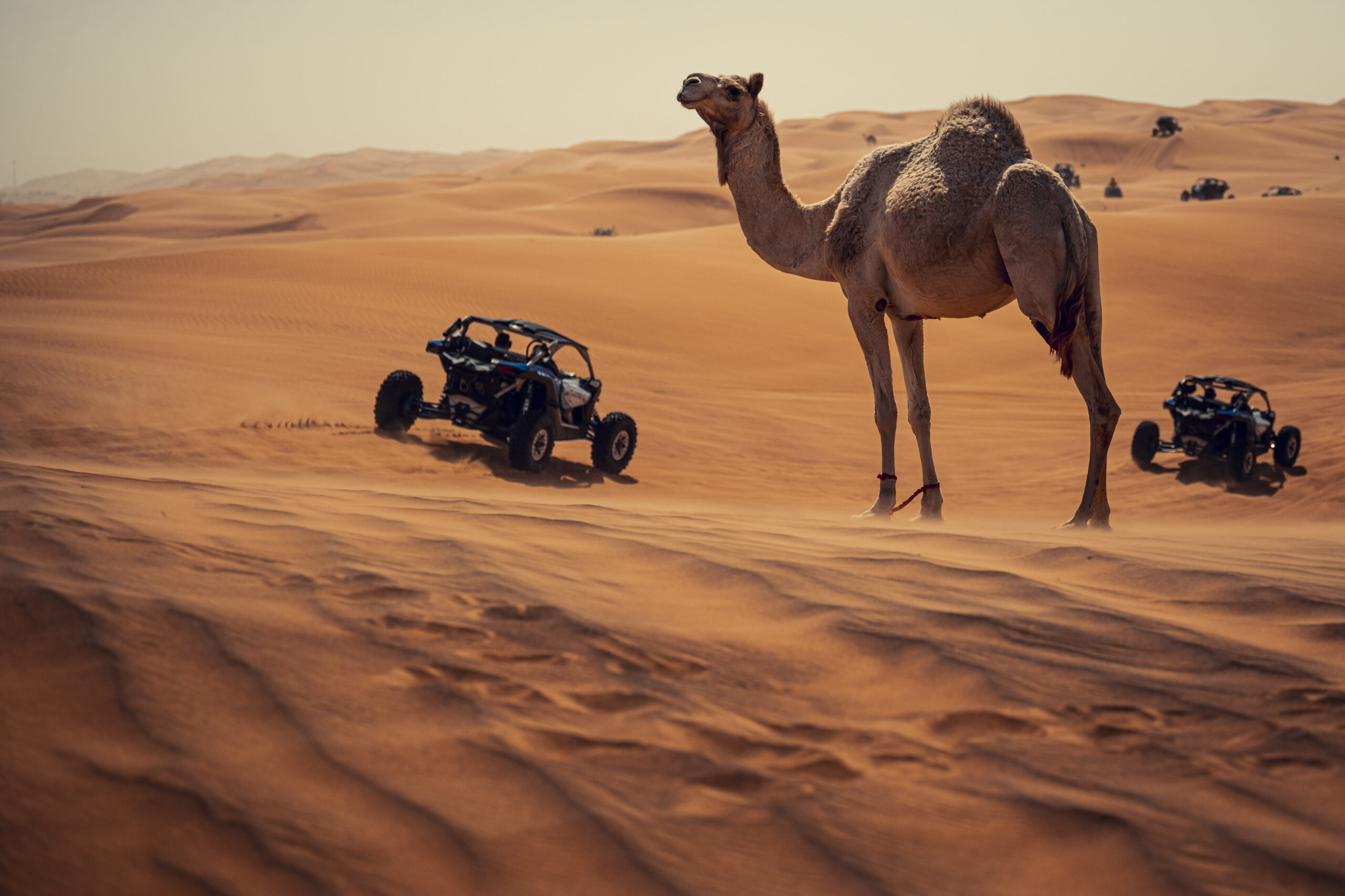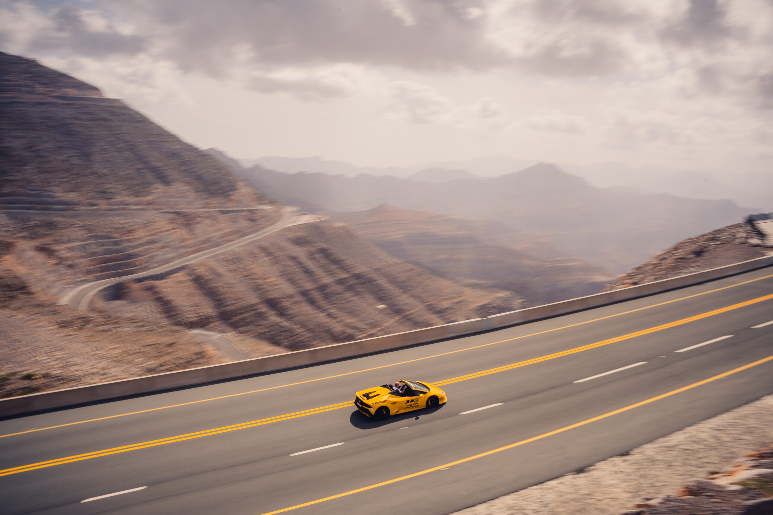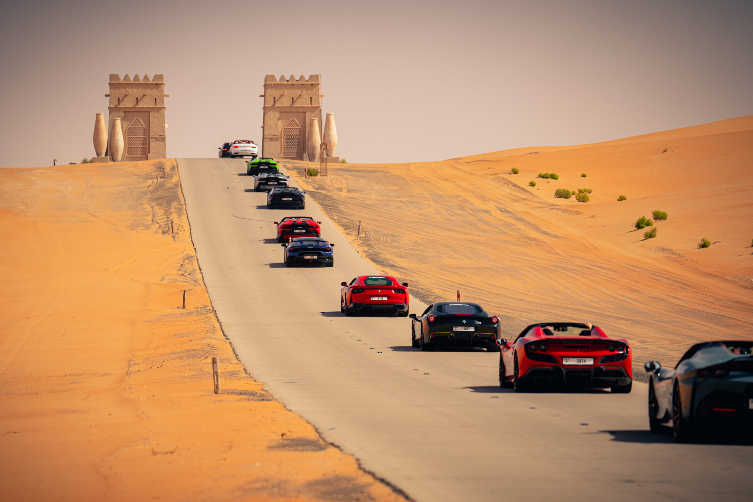 tijdens Arabian Miles een auto huren, staat hun bolide hier te wachten, klaar voor vertrek. Na de lunch starten we met de eerste etappe en laten we de skyline van Dubai achter ons voor een 2 uur durende rit waarbij we steeds iets verder afdwalen en in een prachtig woestijnresort aankomen en waar onze Arabian miles echt Arabian vibes krijgen. We hebben hier de middag om lekker te onspannen en te genieten van al het moois dat deze magische plek ons te bieden heeft.